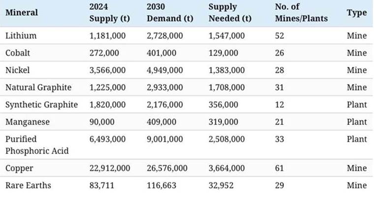 在下表中,请注意,在所有金属中,铜需要最多的吨位,增加3,664,000吨或61台矿山。