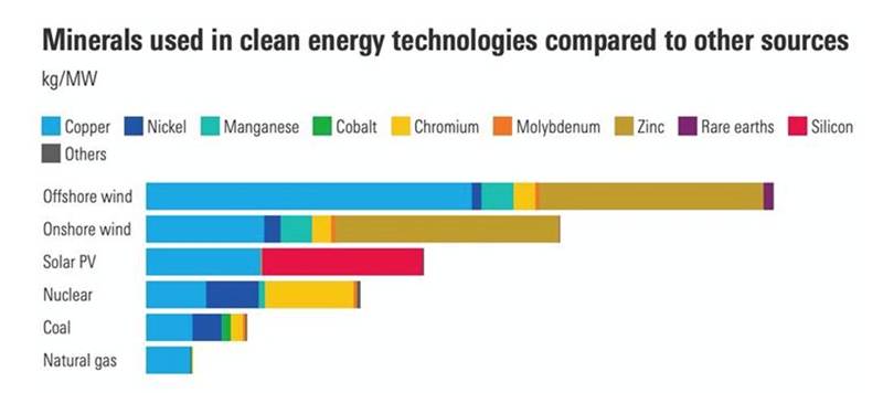 例如,风和太阳能是当今最受欢迎的可再生能源形式之一。下图显示了与化石燃料(如煤炭和天然气)相比,从海上风(海上风力涡轮机)和太阳能光伏所需的铜量。
