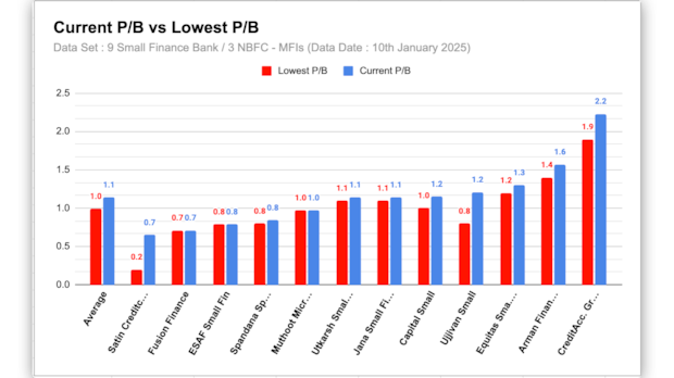 我们密切关注的 12 家 SFB 和 NBFC-MFI 中的大多数交易价格要么接近历史最低市净率估值,要么目前处于历史低点。由于这 12 家小额信贷机构参与者中至少有 5 家是在近期该行业形势良好时上市的,因此它们正在形成新的历史低点。请记住,首次公开募股发生在该行业通常表现良好的时候。