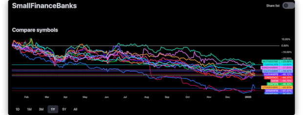 2024 年对于小额信贷玩家来说是痛苦的一年。在最新的“小额信贷混乱”中,上市小额信贷公司的股价较去年下跌了 40-50% 以上。即使是 MFI(小额信贷机构)贷款额仅占贷款总额 6% 的银行也会受到市场的惩罚(IDFC 第一银行)。