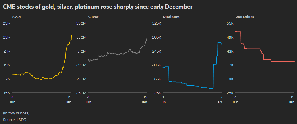 过去六周,纽约商品交易所批准的仓库中的黄金库存上涨了三分之一,因为市场参与者寻求交付以对冲即将上任的美国总统唐纳德·特朗普征收进口关税的可能性。