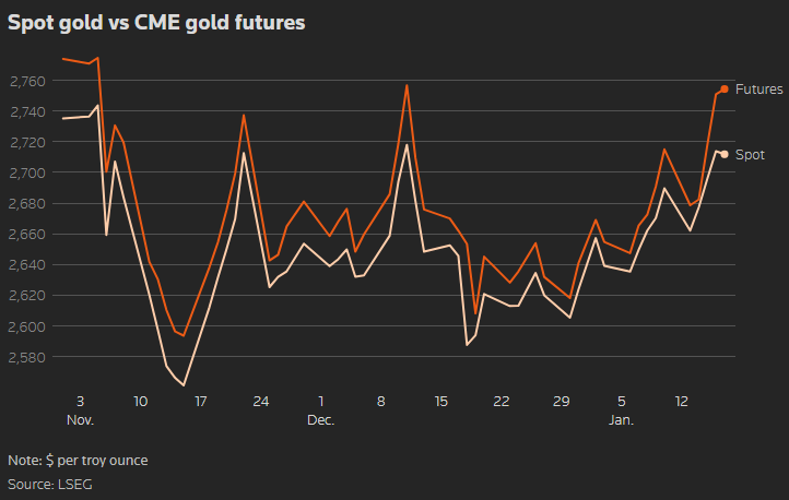 随着特朗普周一就职,COMEX 的活动扩大了纽约和伦敦金价之间的价差,并导致被称为期货实物交易 (EFP) 市场的剧烈波动,该市场被用作一般贵重商业活动的对冲。