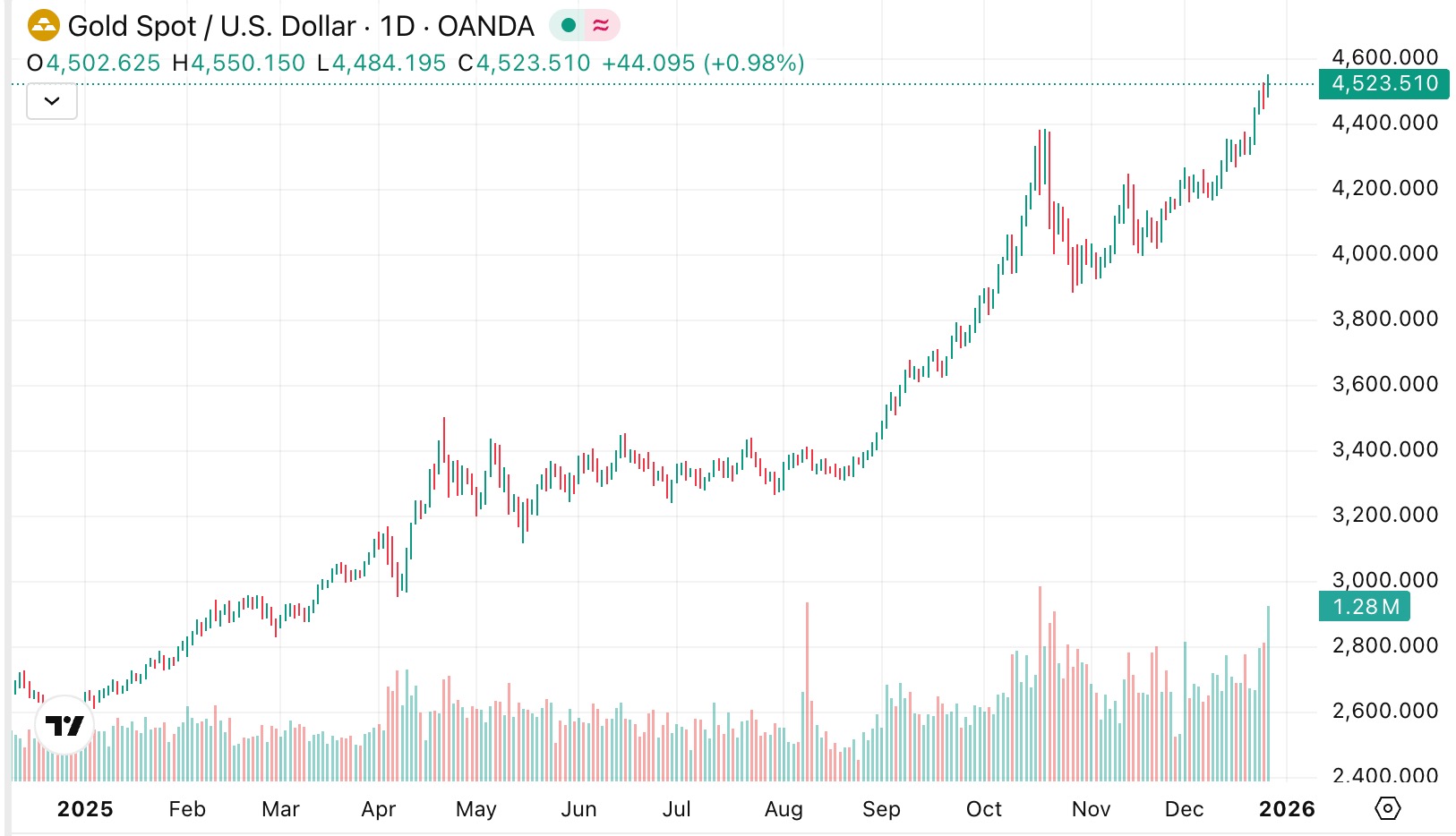现货黄金创下每盎司 4,540 美元的历史新高,2 月份交割的最活跃的美国黄金期货交易价格高达每盎司 4,584 美元,随后在下午交易中上涨至每盎司 4,555 美元。