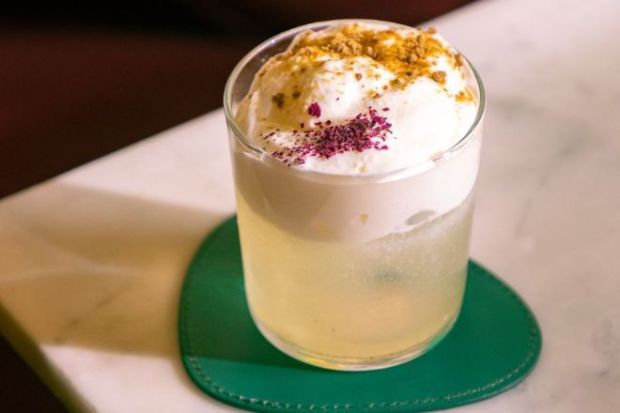 泡沫上漂浮了一滴柠檬或一滴松露油。