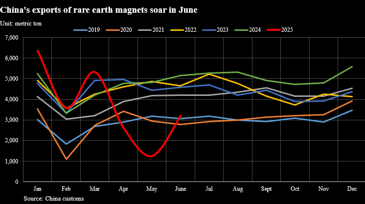 上个月,中国总共出口了3,188吨稀土永久磁铁,比5月的1,238吨增长了157.5%,尽管6月份的数量仍比2024年的相应月份低38.1%。