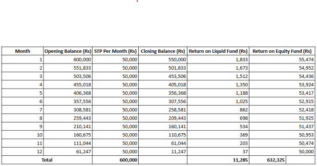 在这里,60万卢比可以首先投资流动基金,并通过在12个月内将50,000卢比转移到最佳股票共同基金中,从而进行STP。