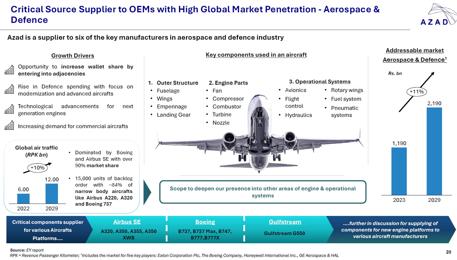 该部门在 2025 财年同比增长 84%,预计在 2026 财年将大幅增长。增长动力包括对商用飞机的需求不断增长(主要由波音和空客推动)、机队现代化计划以及全球国防支出的增加。 Azad 旨在通过进入相关领域来增加其钱包份额。