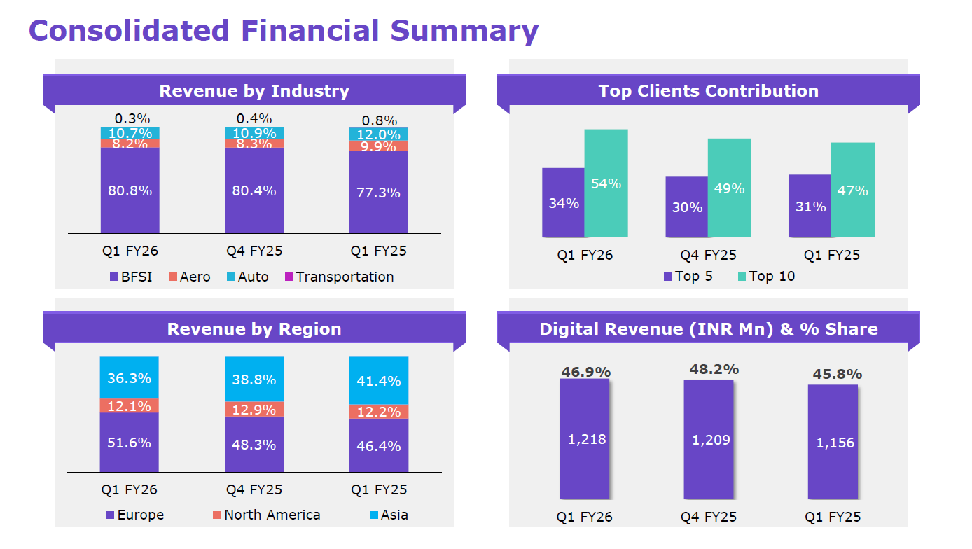 从财务角度来看,收入同比增长 3%,达到 26 亿卢比。 BFSI 行业贡献了 80.8% 的收入,其次是 汽车行业 (10.7%)、航空业(8.2%)等。欧洲贡献了51.6%的收入,其次是北美(12.1%)和亚洲(36.3%)。