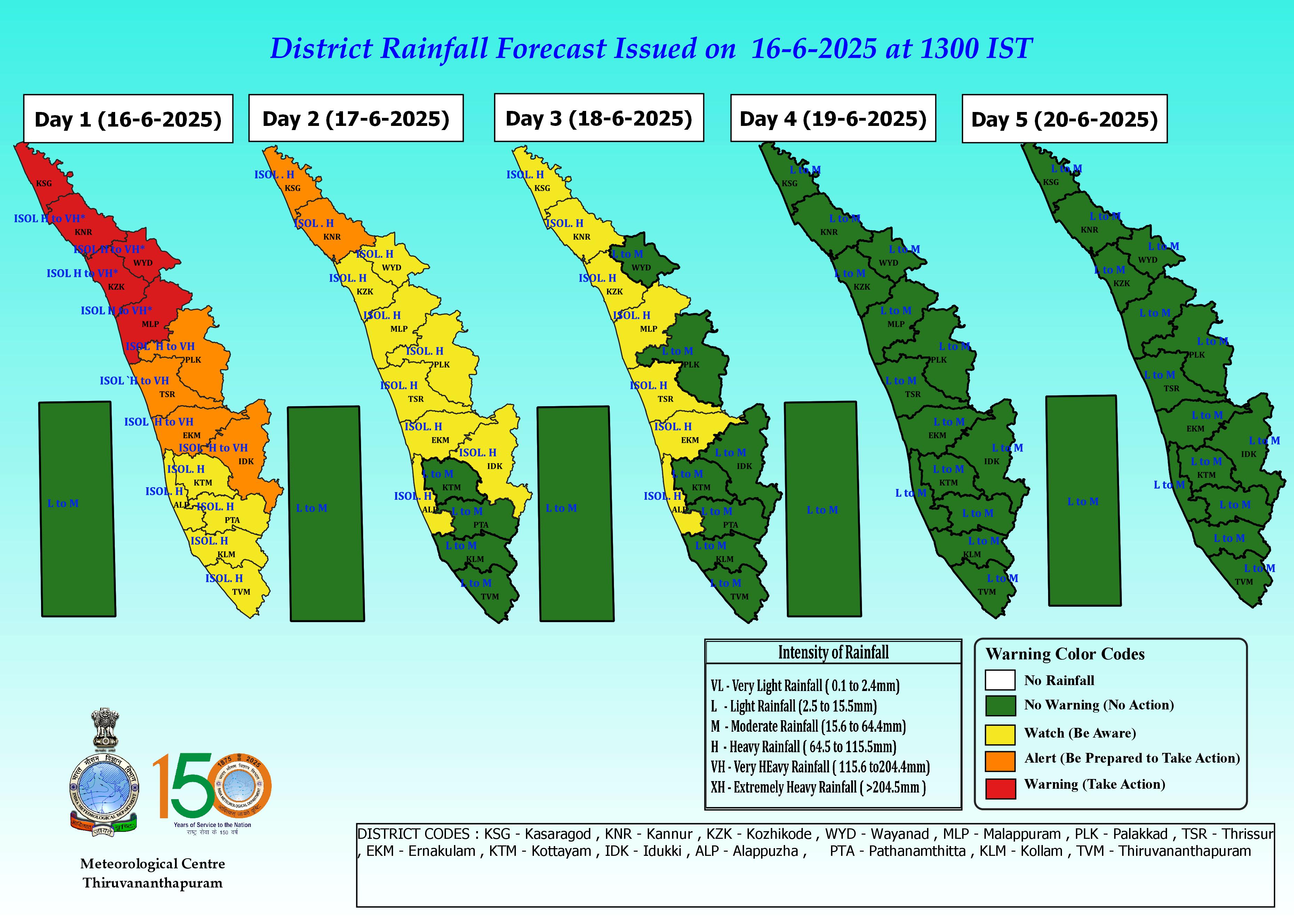 气象中心将喀拉拉邦11个地区的五个地区置于6月16日的红色警报警告下,因为他们遇到了极度的大雨。 6月17日,只有两个地区受到橙色警报。