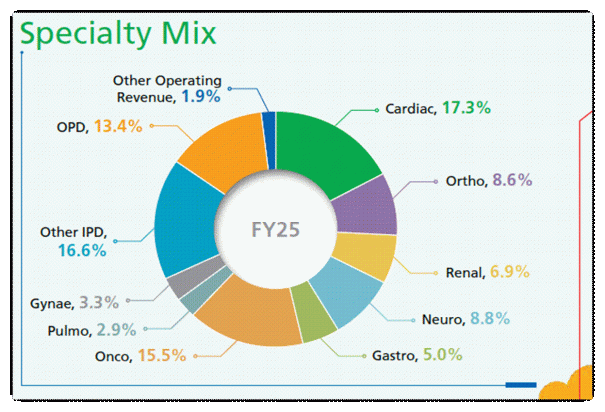 该公司的核心重点仍然是专业医疗保健,包括心脏病学、肿瘤学、骨科、神经科学、胃肠病学和肾脏科学,这些领域占 2025 财年医院总收入的 62%。 2025 财年医院整体入住率为 69%。
