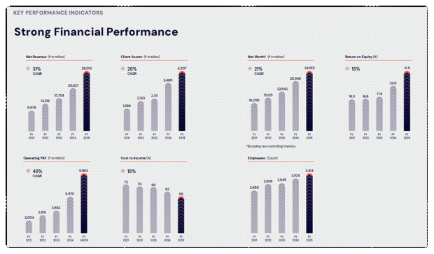 这一增长很大程度上是由其最大的垂直财富管理业务带动的,而增长的动力来自不断增长的高净值个人的强劲需求。该公司正受益于经营杠杆,其成本收入比在此期间下降了 1,800 个基点至 55%。 2025 财年 RoE 增长 800 个基点,达到 31.5%。