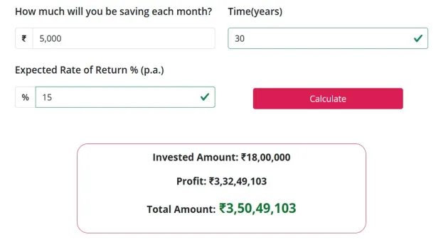 如果一个人在30岁时开始饮食,并且每月连续投资5,000卢比,直到60岁,即总计30年,那么:
