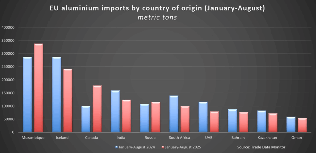 今年前8个月,冰岛是欧盟第二大铝供应国,出口量为241,412吨。最大供应商莫桑比克向该集团出口了 337,670 吨。