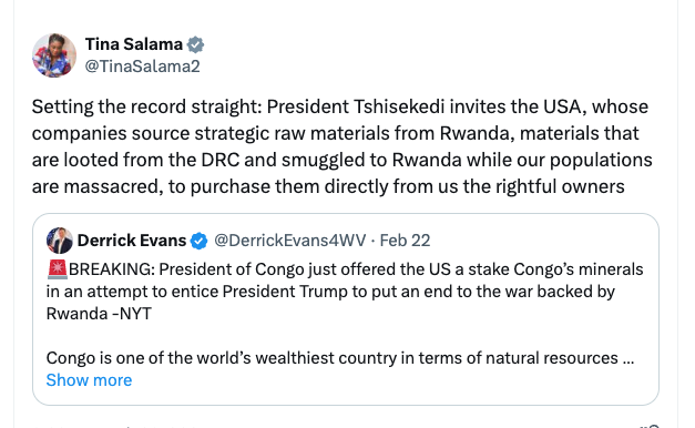 总统发言人蒂娜·萨拉马(Tina Salama)在周日发表讲话时敦促美国直接从金沙萨(Kinshasa)“购买关键的矿物”,而不是通过卢旺达(Rwanda)采购“掠夺”和“走私”资源。她向欧洲和其他买家提出了同样的吸引力,强调刚果糖是这些宝贵商品的“真正所有者”。