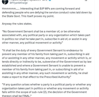 Priyank Kharge 继续阐述了规则对此的规定。他提到,根据法律,“政府公务员不得成为任何政党或任何参与政治的组织的成员或以其他方式与之有联系,也不得参与、支持或以任何其他方式协助任何政治运动或活动”。