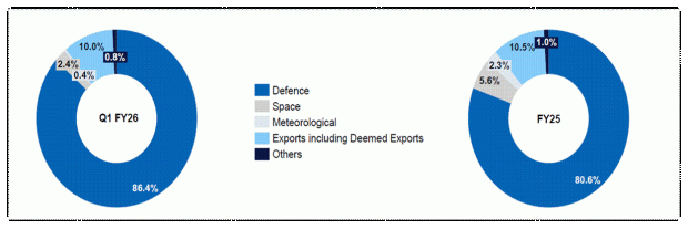 雷达在Q1FY26的收入中贡献了66.4%,使其成为最大的收入推动力。通过客户组合,Bharat Electronics占收入的63.1%,其次是出口(10%),DRDO(9.9%),印度斯坦航空(1.8%)等(14.8%)。