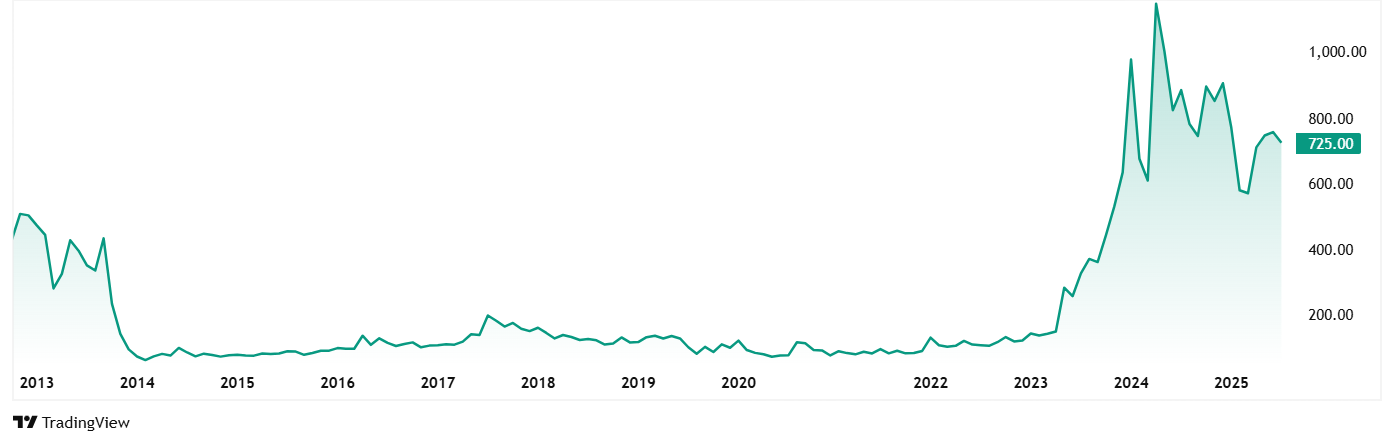 Star Delta Transformers的股价在2020年7月的74卢比左右,截至14Th 2025年7月,价格为725卢比,在5年内跃升了近880%。 5年前投资于股票的1卢比卢比今天将接近10卢比的LAC。