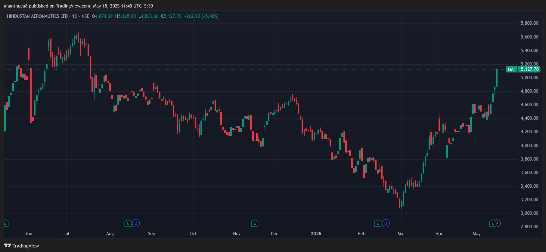 印度航空公司 (HAL)在此期间,股票上涨了14%,至5,115.50卢比。有趣的是,这要高于上一年股票的接近7%。国防专业的子公司已与Garuda Aerospace签署了共同的开发合作伙伴关系,以开发高级精密无人机。