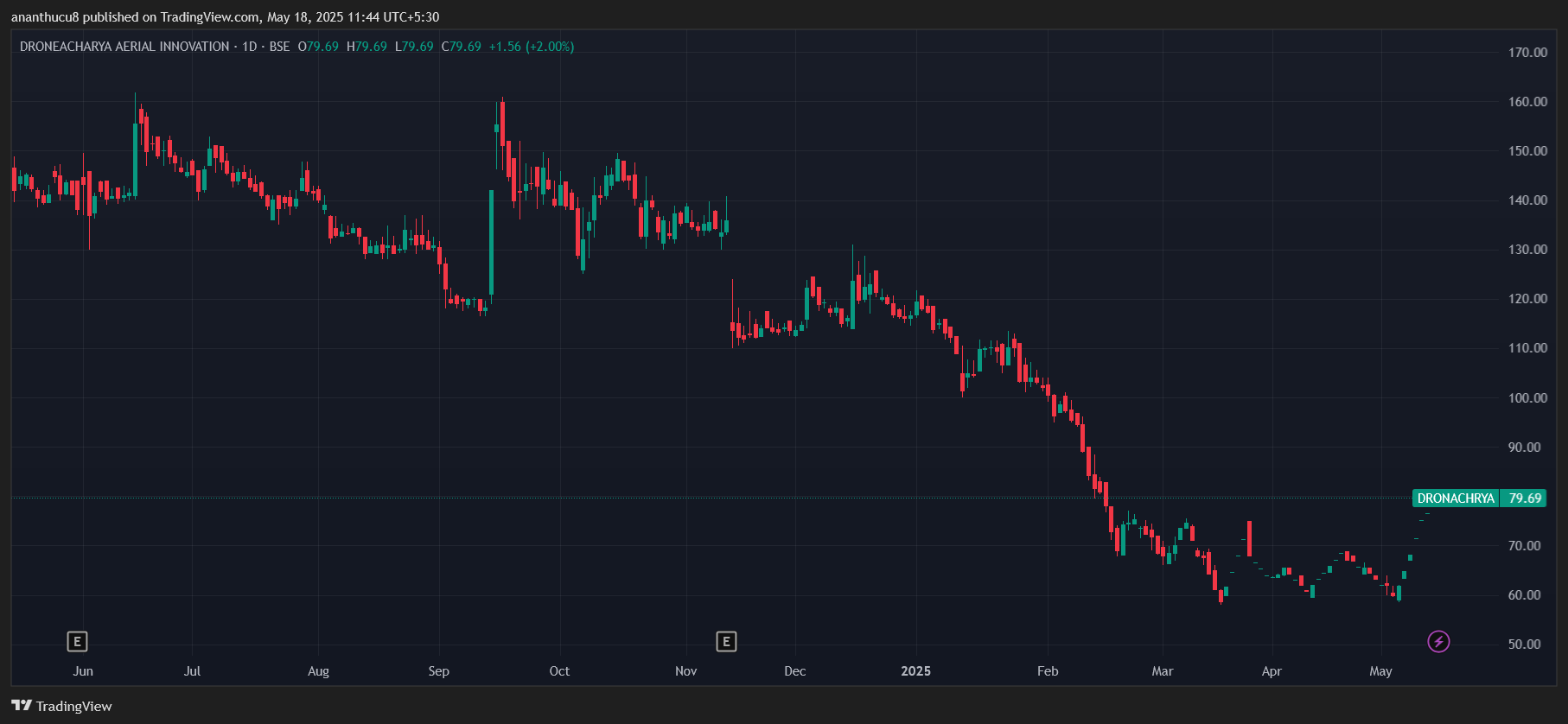 Droneacharya空中创新 在这段时间内,已飙升了近29%,达到79.69卢比。但是在过去的一年中,该股票下跌了44%。该公司从事无人机操作培训。它着重于提供调查,数据处理和试点培训。