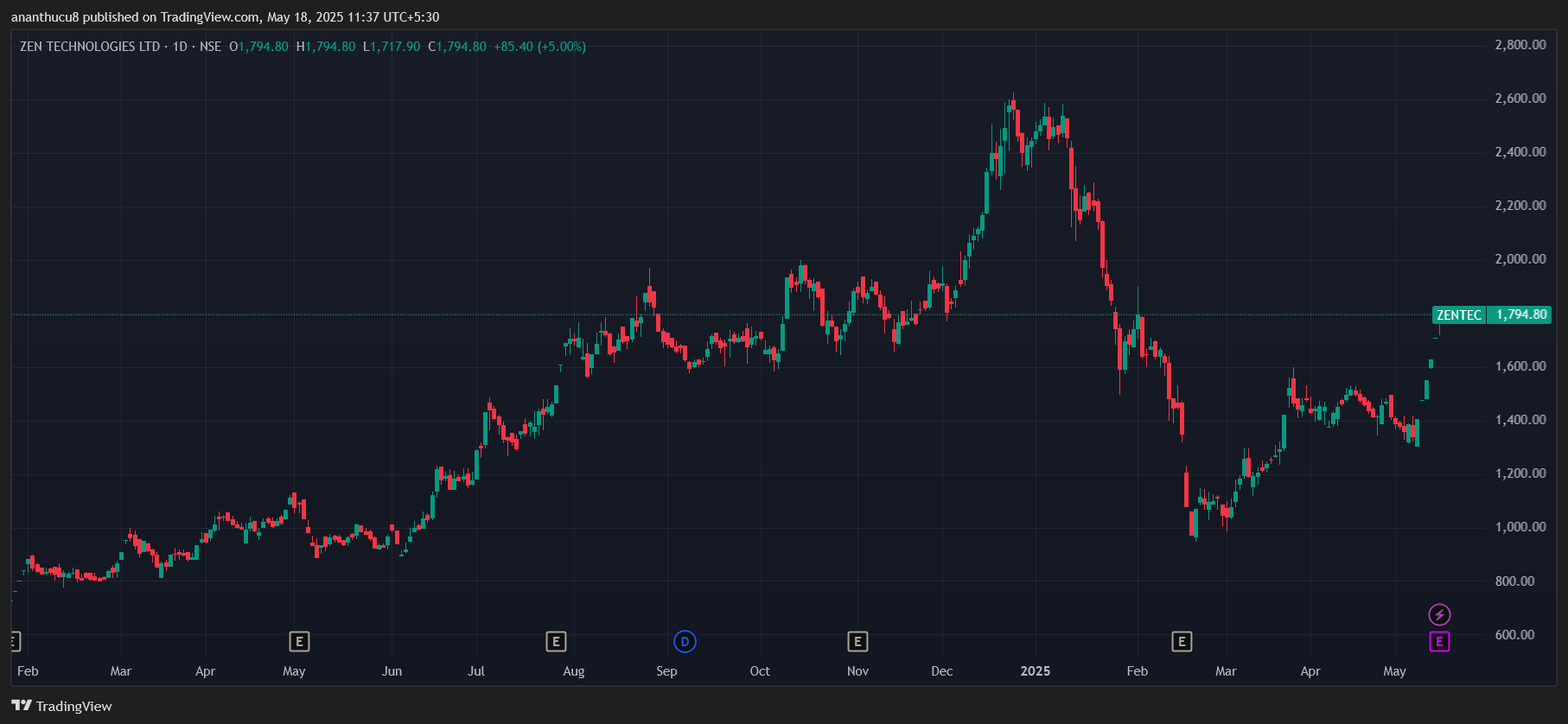 禅宗技术 自5月7日至1,794.8卢比以来,已近36%的收益。该股在过去的一年中的表现良好,收益近86%。 ZEN Technologies致力于为国防和安全部队提供战斗训练解决方案。这包括反无数解决方案。