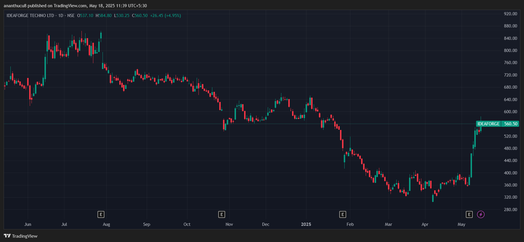 Ideaforge技术 在此期间获得最大的收益,增长56%,至558.2卢比。但是,在过去的一年中,该股票下跌了22%。该公司主要用于无人飞机系统(UAS)的制造。无人机既有民用和军事应用。