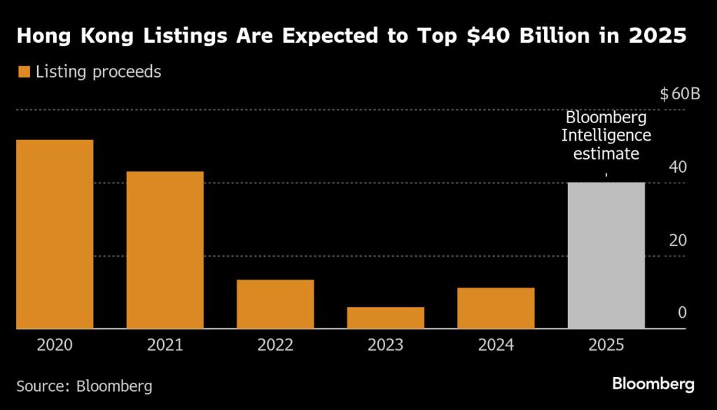 据 Bloomberg Intelligence 估计,香港上市将于 2025 年结束,创四年新高,募集资金可能超过 400 亿美元。但最近一些上市公司首次亮相时遭遇失败,这表明投资者在经历了辉煌的一年后变得越来越怀疑。