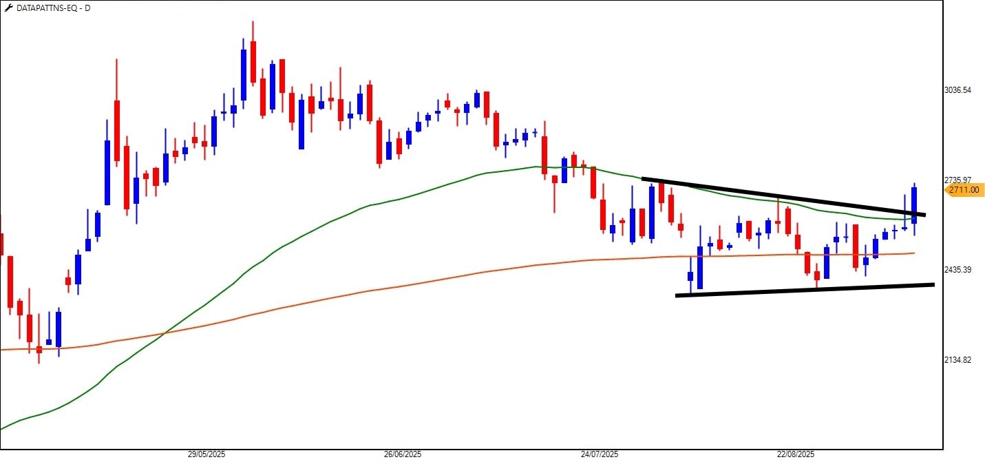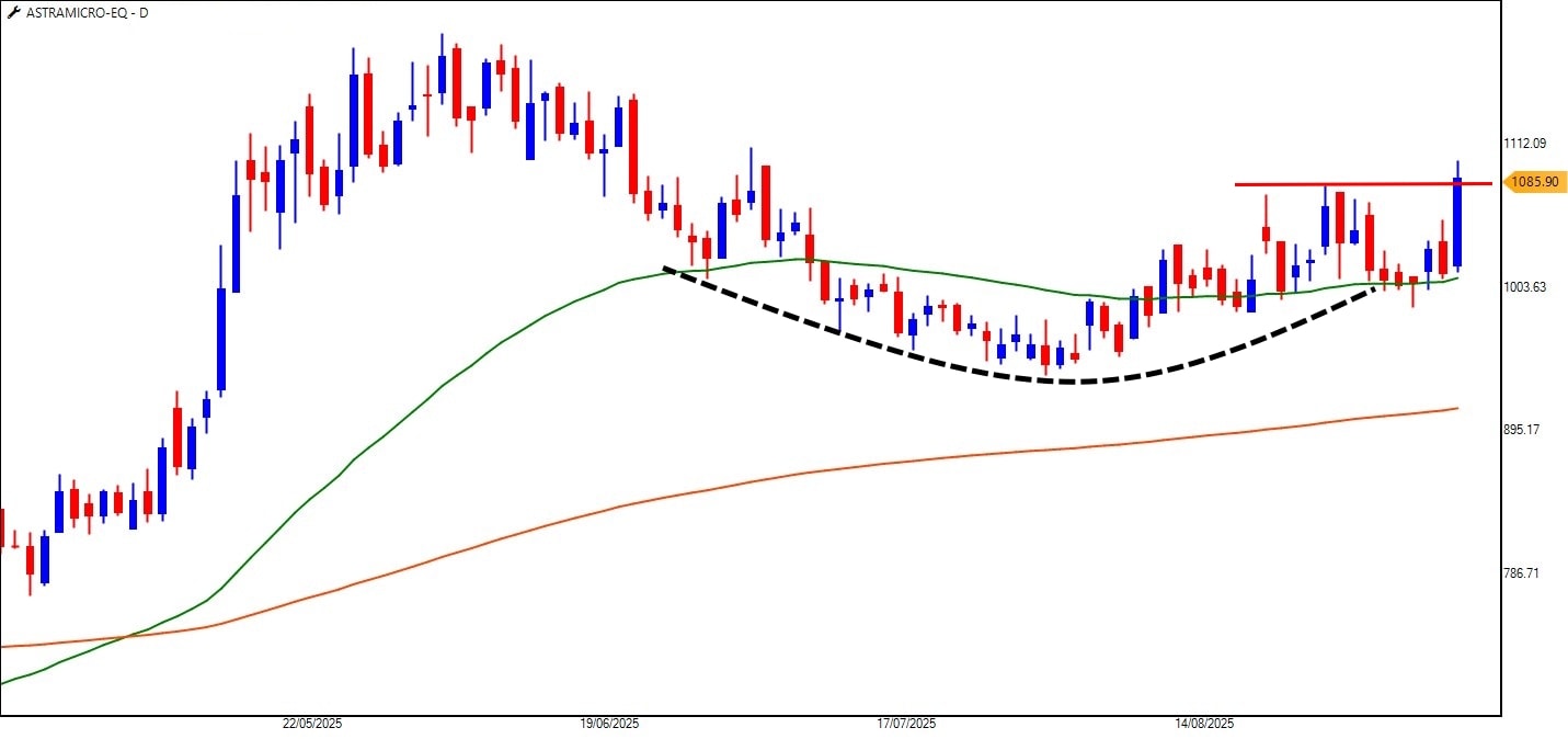 从2025年6月到2025年8月,该股票在卢比之间振荡。 950-1,050,建造圆形底层。有趣的是,这个基础是围绕50DEMA和200DEMA创建的,通常被视为智能资金进入的需求区域。