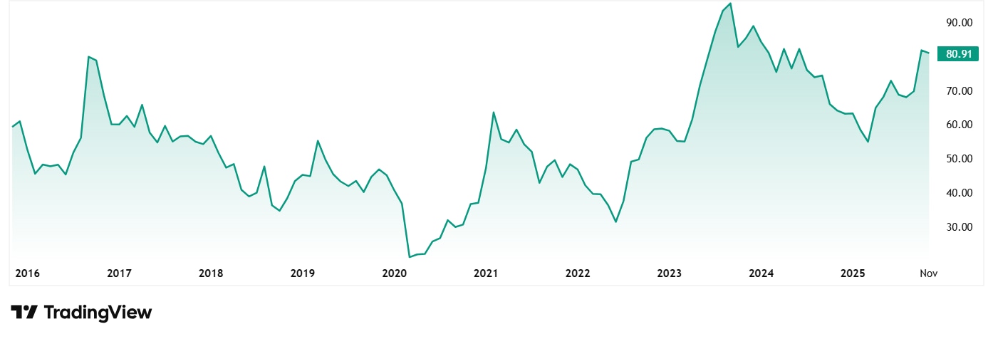 2020 年 11 月 IDFC First Bank Ltd 的股价约为 32 卢比,截至 10 日已升至目前的 81 卢比th 2025 年 11 月。