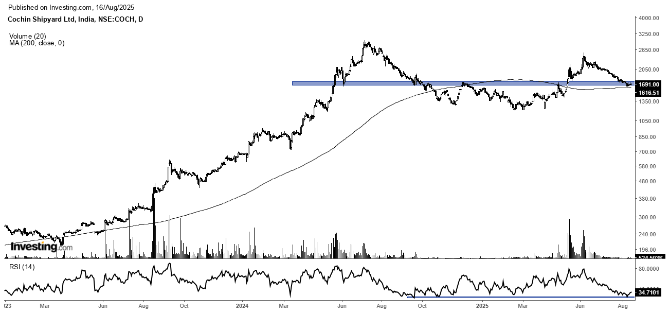 科钦造船厂也一直在狂奔。从2024年4月到2025年2月,痛苦的60%下降后,它咆哮着,从那本教科书倒立的头部和肩膀模式中爆发出来,在四个月内几乎翻了一番。我已经看到,在那些关键的移动平均值和以前的突破级别上,它找到了您期望的支持。 RSI还在超售领土上闪烁一些看涨信号,因此,如果这个故事还没有结束,我不会感到惊讶。