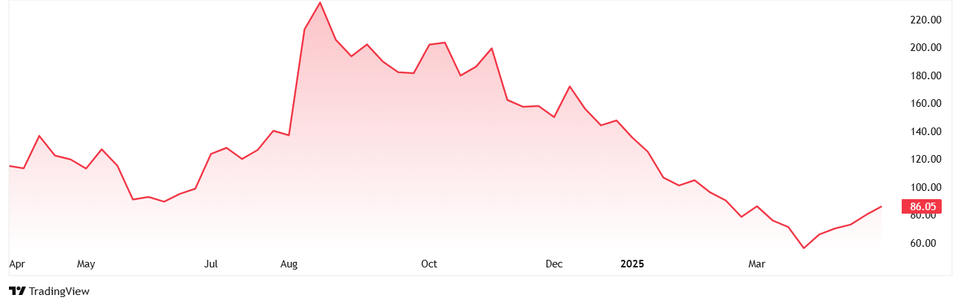 纳曼(Naman)在店内的股价在2024年4月上市的股价约为118卢比,现在已经下跌至86卢比ND 2025年5月。