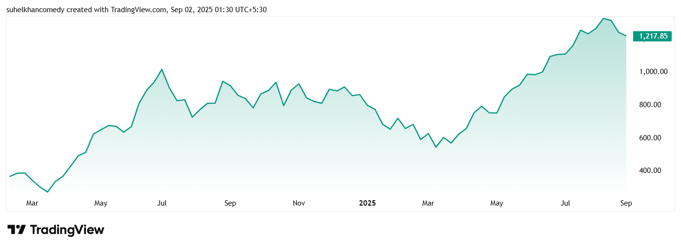 Alpex Solar Ltd的股价在2024年2月上市时约为362卢比,截至1英石 2025年9月,是1,218卢比。这是不到2年的237%的增长。