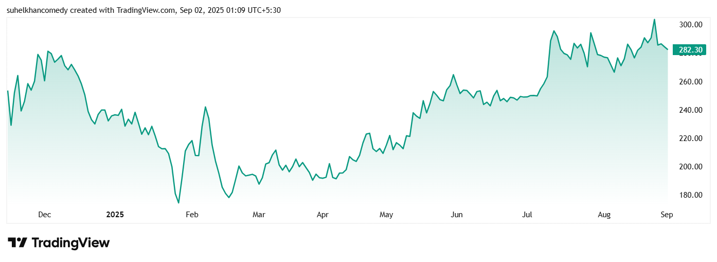 Acme Solar Holdings Ltd在2024年11月上市的股价约为253卢比,截至1英石 2025年9月的价格为282卢比,增长了12%。在同一时期,股价的历史最高额为310卢比,低点为168卢比。