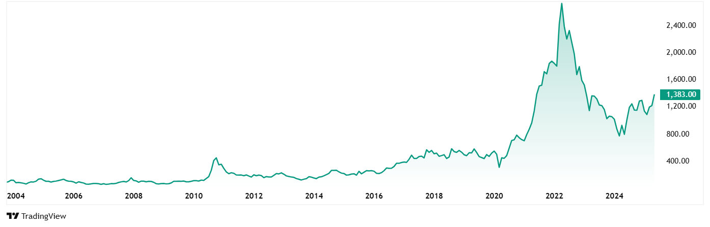 Polyplex Corporation的股价约为2020年5月的433卢比,截至27岁,该价格已上涨至1,372卢比的当前价格。Th 2025年5月。这是216%的增长。