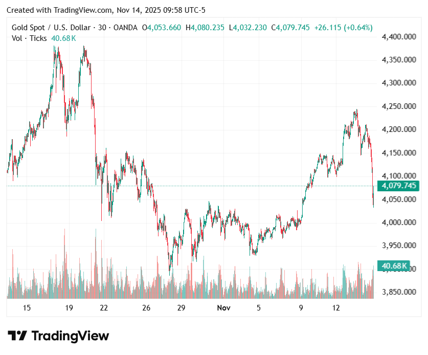 现货黄金在早盘交易中跌至每盎司 4,034.54 美元的低位,抹去了过去几个交易日的大部分涨幅,此前该金属看起来正朝着一个月来的最佳周表现迈进。