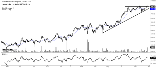 该股最近形成接近前期高点的上升三角形,表明可能出现突破。价格高于重要阻力位20日移动均线,而RSI仍高于60,确认了积极趋势。这些因素意味着 Laurus Labs 或许能够在不久的将来继续其上升轨迹。