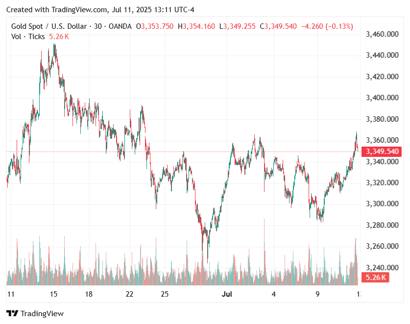 在交易的凌晨,斑点黄金在每盎司时获得高达1.2%至3,368.88美元,然后在3,350美元左右定居之前。美国黄金期货每盎司上涨1.6%,至3,381.60美元。