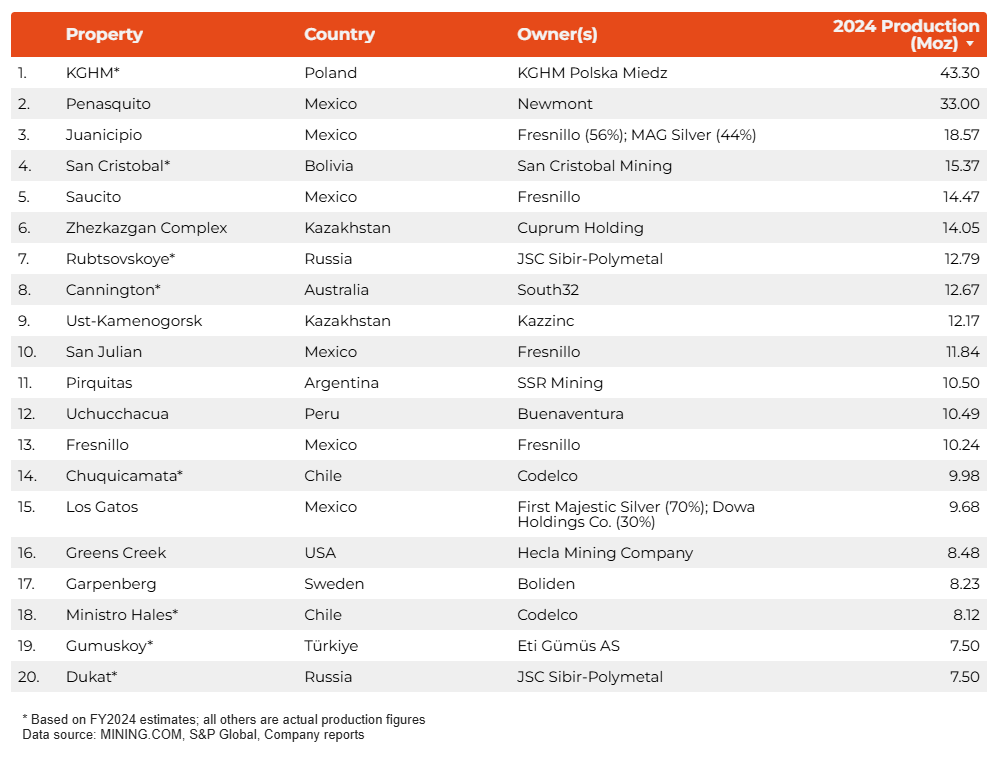 弗雷斯尼略(Fresnillo)在墨西哥的同名矿山于2024年生产了10.24 Moz。全球顶级银生产商弗雷斯尼洛(Fresnillo)在该国经营着七个矿山。