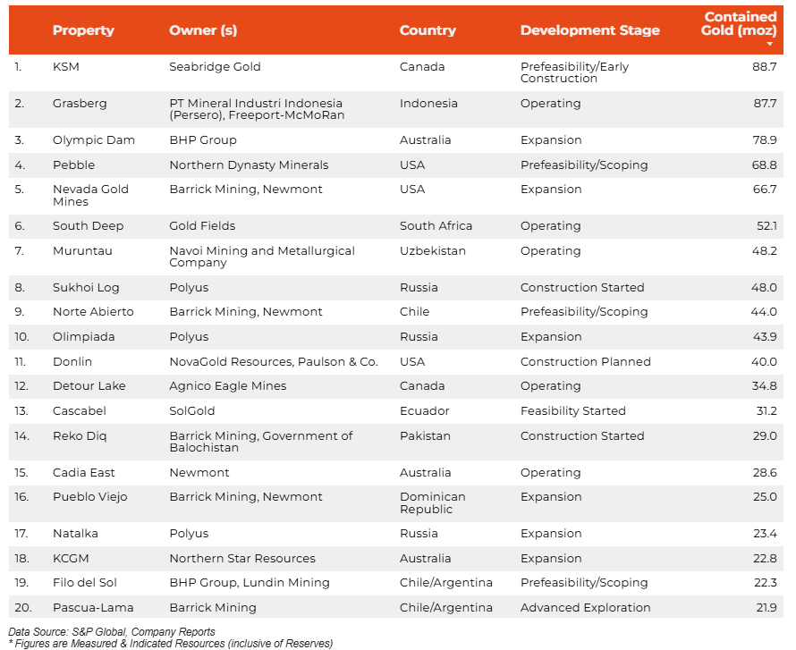 尽管按实测和显示的黄金资源(包括储量)排名的 20 个最大的资产中,有一些面临着投入生产的艰苦战斗,而且许多绿地资产已停滞多年,但随着金价持续上涨,潜在项目的储备仍在不断增加。
