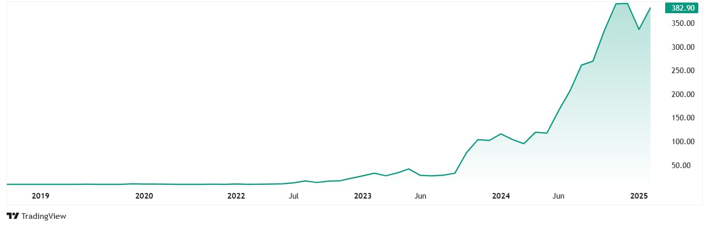 让我们看一下这些数字如何反映在股票价格中,该股票价格从2020年2月10日的卢比增长到目前的365卢比(如5Th 2025年2月)。这是短短5年内惊人的104%的复杂增长。