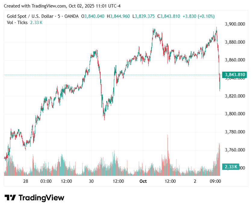 斑点黄金占每盎司3,896.43美元的新纪录,但此后已退回到3,830美元左右。在上一个会议中,它的交易高达每盎司3,895.13美元。