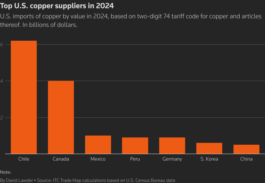 智利约占全球铜供应的四分之一,使其成为世界上最大的生产商。它的大部分出口向中国。自2004年以来,它向美国的进口涵盖了一项自由贸易协定。