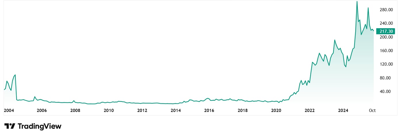 Jagsonpal Pharmaceuticals Ltd 2020 年 11 月调整后股价约为 16 卢比,截至 6 日th 2025 年 11 月,价格为 217 卢比,涨幅超过 1,250%。 5 年前投资该股票的 1 卢比(拉克)相当于今天的 13.5 卢比(拉克)。