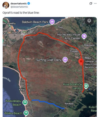 用户甚至分享了该地区的卫星地图,显示了奥普拉(Oprah)据称是封闭的私人道路,这是从Kohei到安全区Keokea的最短路线。其他人质疑她为什么以及如何做到这一点。