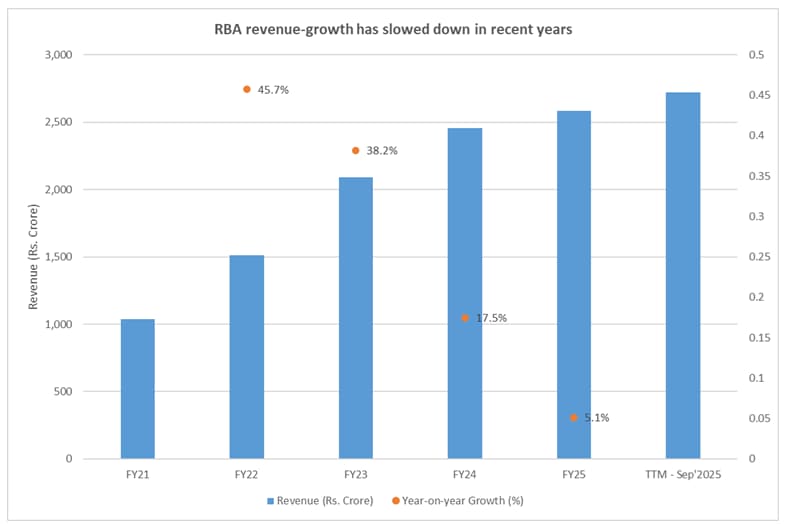 在围绕其上市价格徘徊多年后,自 2024 年 9 月以来,RBA 的股价已调整了超过 40%。当然,多年来增长有所放缓,但基数不断上升——同比收入增长已从 21 财年的 45.7% 放缓至 25 财年的 5.1%。
