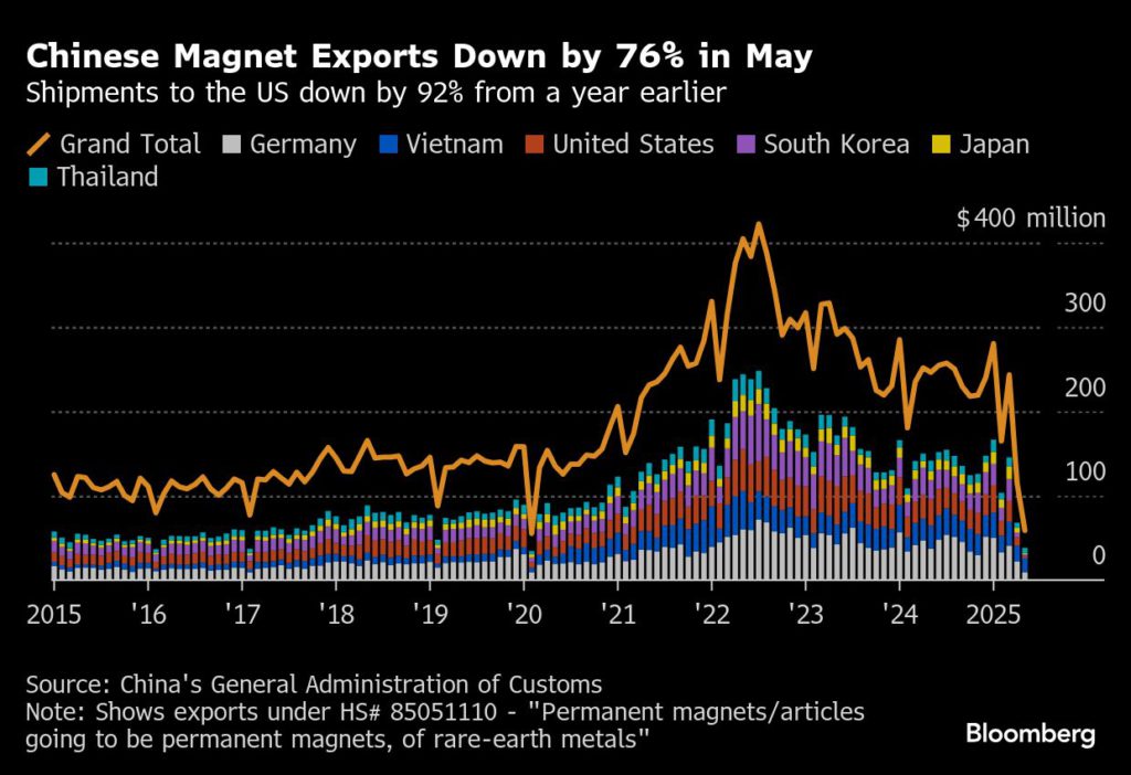 为美国公司增加一层危险的危险,中国供应商在美国的军事工业基础上不太可能获得任何磁铁许可。特朗普在4月对高价征收高价后,北京将萨玛里姆(Samarium)放到了指导导弹,智能炸弹和战斗机等武器所必需的金属上 – 专门禁止其用于军事用途的双重使用清单。