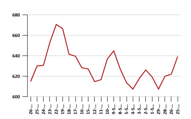 在过去的五天中,Raymond Realty的股价从670卢比下降到592卢比。在过去的一个月中,股价略有下跌。