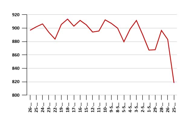 该股票于2025年7月1日触及了其52周的1,005.2卢比,并在2025年9月29日的52周低点为592卢比。