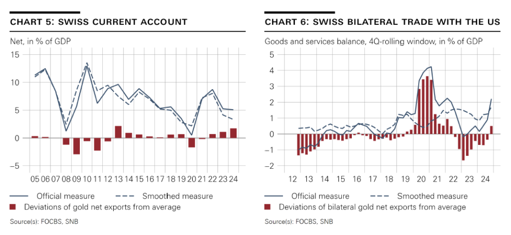 SNB研究说,尽管黄金是瑞士最大的进出口,但在不确定性时期购买金属的安全动机“可能会扭曲国家的外部部门指标,例如经常账户”。