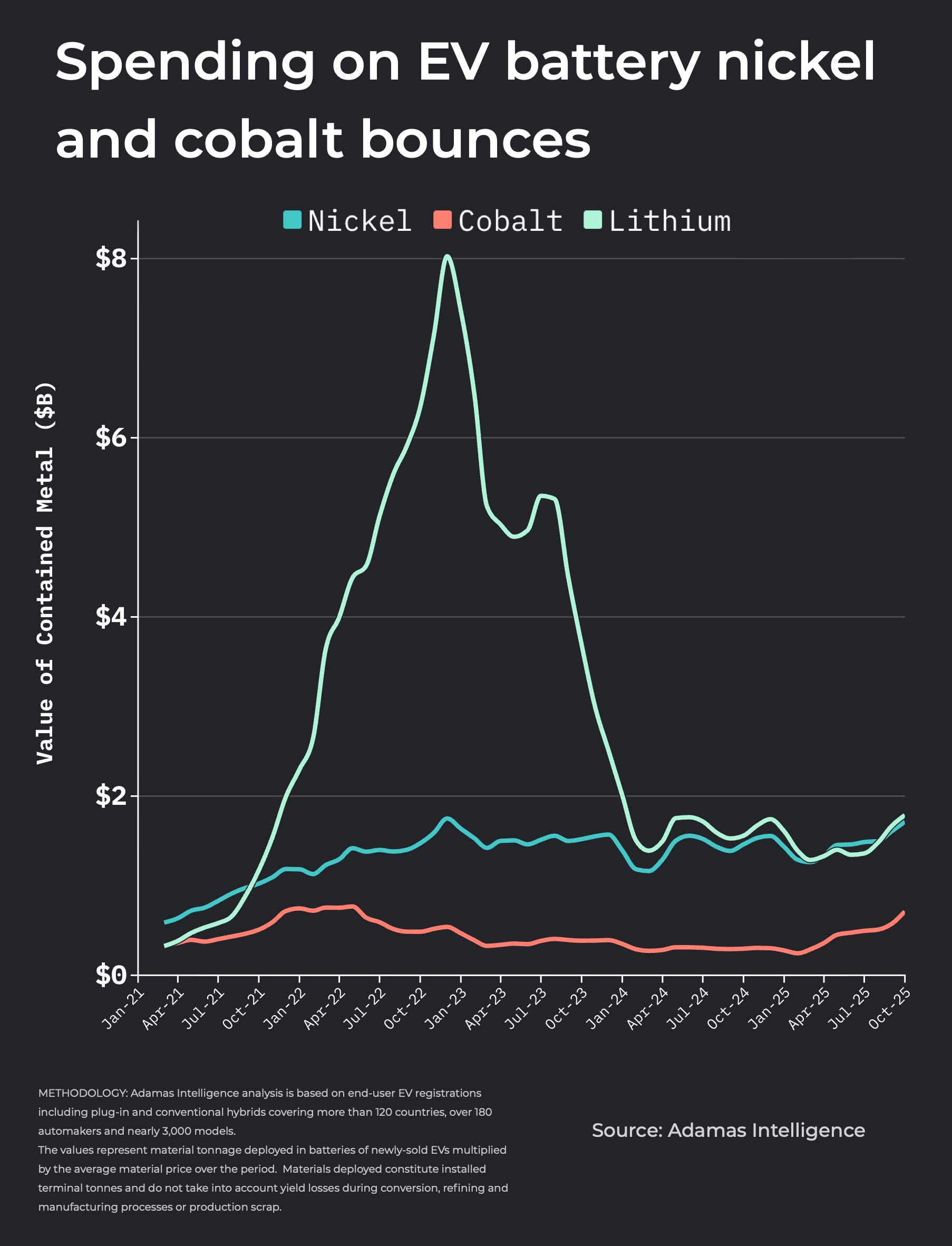 进入 2025 年,镍钴电池市场价值的繁荣还得益于美国电动汽车买家在 9 月底零售激励措施到期之前提前购买后的飙升。