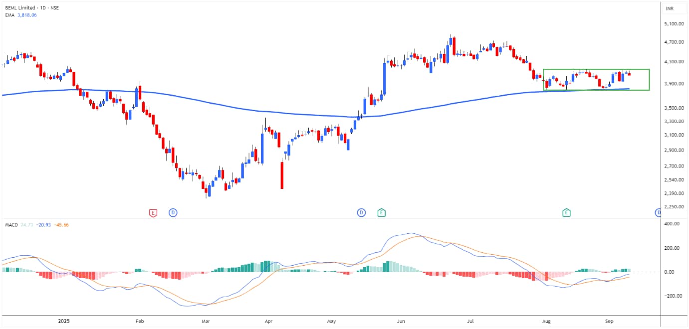 尽管仍在等待确认,但200 dema,矩形合并和积极的MACD设置的支持融合使BEML成为值得潜在机会的股票。